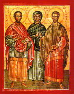 ![]() p Η Κοίμηση της Θεοτόκου στο παρεκκλήσιο της Αγίας Άννης σε αγιογράφηση Γεωργίου Κόρδη. u Οι Άγιοι Ανάργυροι Κοσμάς και Δαμιανός μετά της μητρός αυτών Θεοδότης. (δια χειρός Φωτίου Κόντογλου, 1949) |