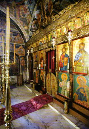 t Εσωιερικό του Καθολικού με τμήμα του περίφημου ξυλόγλυπτου τέμπλου. Φιλοτεχνημένο από τον ιερέα Ιωάννη Σφύρικα το 1711, θεωρείται ένας από τους μεγαλύτερους θησαυρούς της Μονής.
