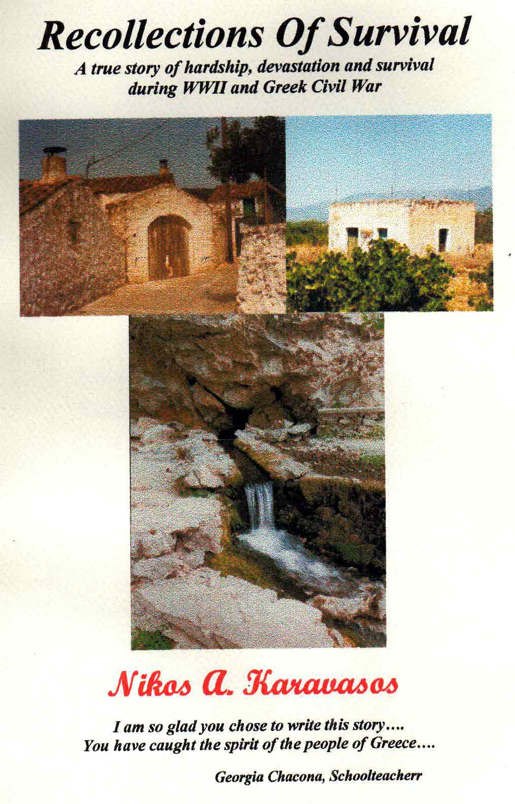 Recollections of Survival A true story of hardship, devastation, and survival during WWII and the Greek Civil War Nikos A. Karavasos Nikos takes you through a family's painstaking adventure of famine, terror, and daily struggles for survival during the German occupation of Greece, as well as the subsequent immoral struggle of Greeks killing each other - father against son, husband's family against wife's family, brother against brother. We have heard numerous times of death camps and millions of Jews killed by the Germans. Movies were made of the Holocaust, Schindler's List, and others but that is not the only place where the Germans committed atrocities. In Greece more than 50,000 Jews were killed and many more Greeks lost their lives. Even in my small village of Zoupena the Nazis gunned down twenty-one innocent people in cold blood. As if the WWII catastrophe was not enough, a more internal war in Greece took the country into deeper depths of sufferings. A young boy's candid account of the events as he experienced them provides a remarkable trail of famine, terror, and survival for himself and his family. If interested in purchasing the book, Recollections of Survival, please contact: Nikolaos (Nick) Caravasos Email: