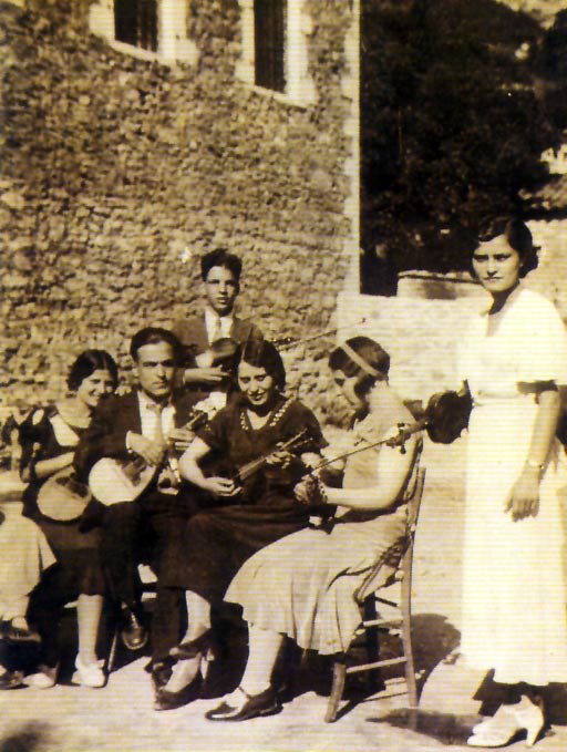 | Ιστορική φωτογραφία των αρχών της δεκ. του 1930 πλάι στο Δημοτικό Σχολείο των Τσίντζινων. Εικονίζονται μέλη του Συλλόγου Κυριών και Δεσποινίδων του χωριού, με άψογη ενδυμασία, να κάνουν πρόβες με τα μουσικά τους όργανα. Όρθια στα δεξιά, ντυμένη στα λευκά, είναι η κόρη του επιχειρηματία μετανάστη στην Αίγυπτο Δημοσθένη Διάκου. (Φωτ. αρχείο: Η. Ανδριτσάκη). |