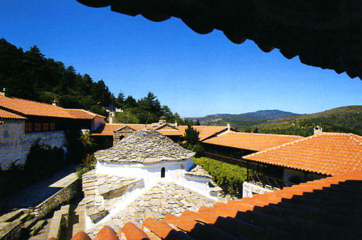 Εσωτερικό της Μονής Αγ. Αναργύρων με τον πλακοσκέπαστο τρούλλο του Καθολικού και αριστερά τμήμα από το Αρχονταρίκι. |