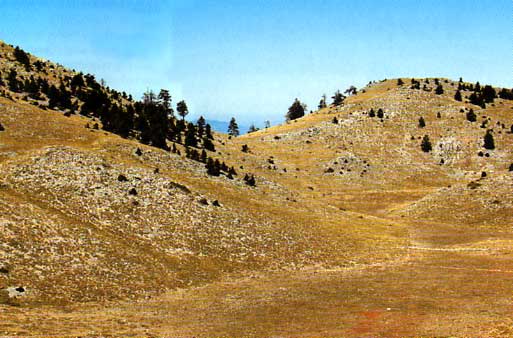 25'αργότερα φτάνουμε σ' ένα πλάτωμα, στα ριζά της βραχώδους και απόκρημνης κορυφής του Προφητηλία (1.780 μ.), του "Μεγαναηλιά", όπως τον αποκαλεί ο Δάσκαλος. Εδώ βρίσκεται ένα μεγάλο πλακόστρωτο αλώνι με θέα εξαιρετική, ιδανικό για μια λιγόλεπτη ξεκούραση. Συνεχίζοντας ΒΔ το μονοπάτι στη βάση της κορυφής φτάνουμε σ' ένα 5λεπτο στην Πηγή του Μεγαναηλιά, με υπέροχο δροσερό νερό, ποτίστρα και αρκετά πρόβατα. Σε λίγο παρακάμπτουμε την κορυφή του Μεγαναηλιά και αντικρΰζουμε απέναντι μας στα ΒΑ την καμπυλόγραμμη κορυφή "Ψάρι" (του "Ψαρή" συμφωνά με την ορολογία του Δάσκαλου), που με υψόμ. 1839 μ. είναι η δεύτερη σε ΰψος κορυφή του Πάρνωνα μετά την "Μεγάλη Τούρλα" (1934μ.). Βαδίζουμε επί μισή περίπου ώρα σε πετρώδες αλλά ευχάριστο μονοπάτι, με ελάχιστες υψομετρικές διαφορές. Η βλάστηση σ' αυτή την υποαλπική ζώνη είναι υποτυπώδης, μόνον χόρτα και χαμηλοί θάμνοι. Σ' ένα σημείο βρισκόμαστε πάνω από ένα όμορφο λεκανοπέδιο, ιδανικό βοσκότοπο. |
